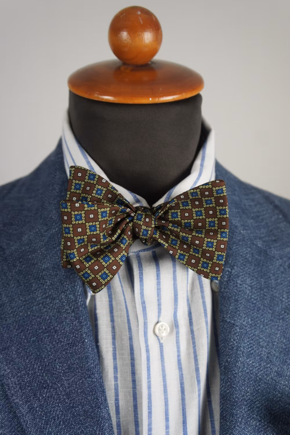 Floral Hand Printed Silk Bow Tie - Brown/Green/Blue 699 kr I lager. Lägg i korgen Dela Artikelnummer: 6600 Information Recensioner Blommönstrad sidenfluga. Tyget är handtryck i England av Adamley Textiles. Tyg från EnglandHöjd 5,5 cmFluga att knyta med inställbart halsmåttTillverkad i Italien