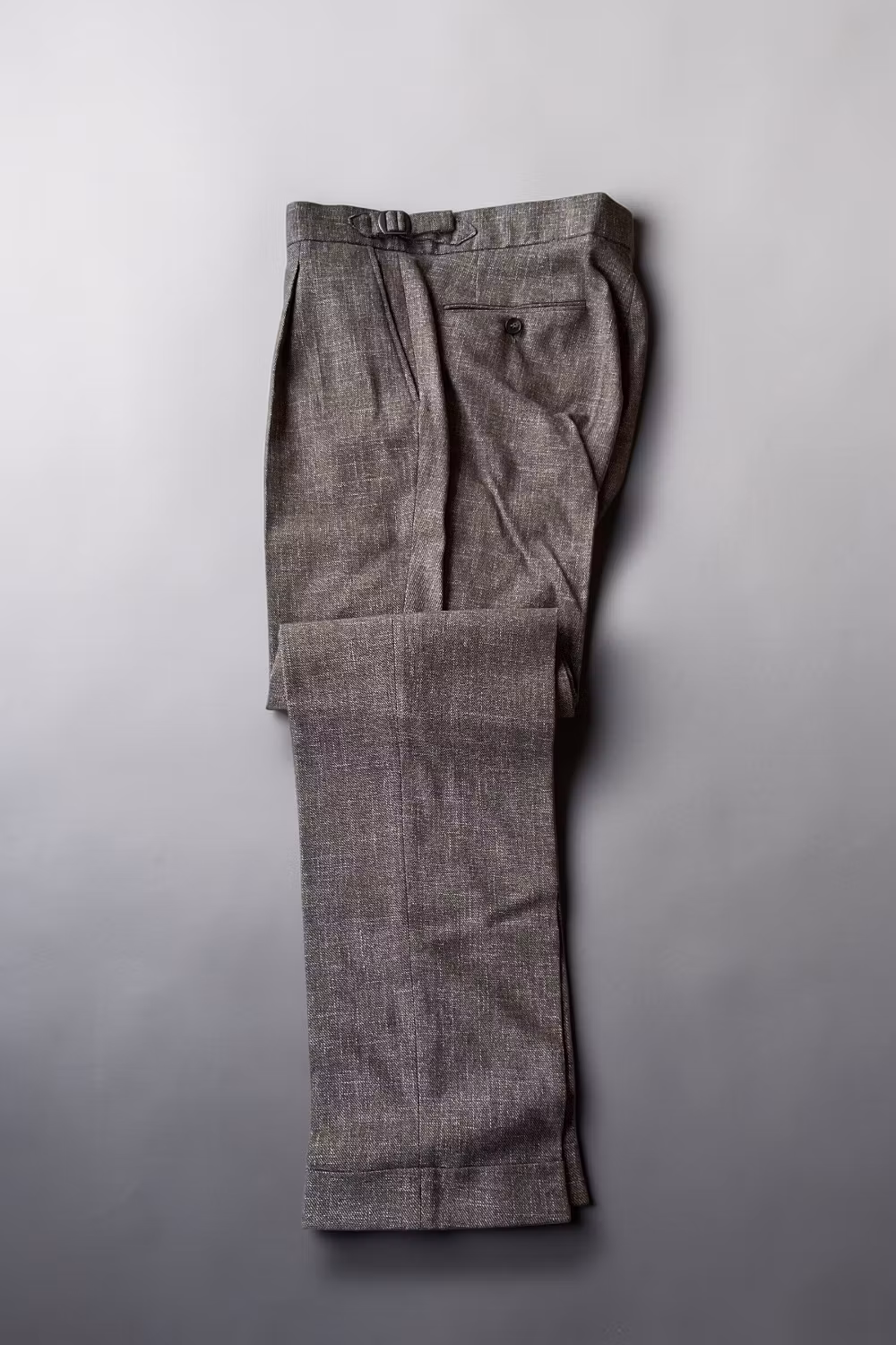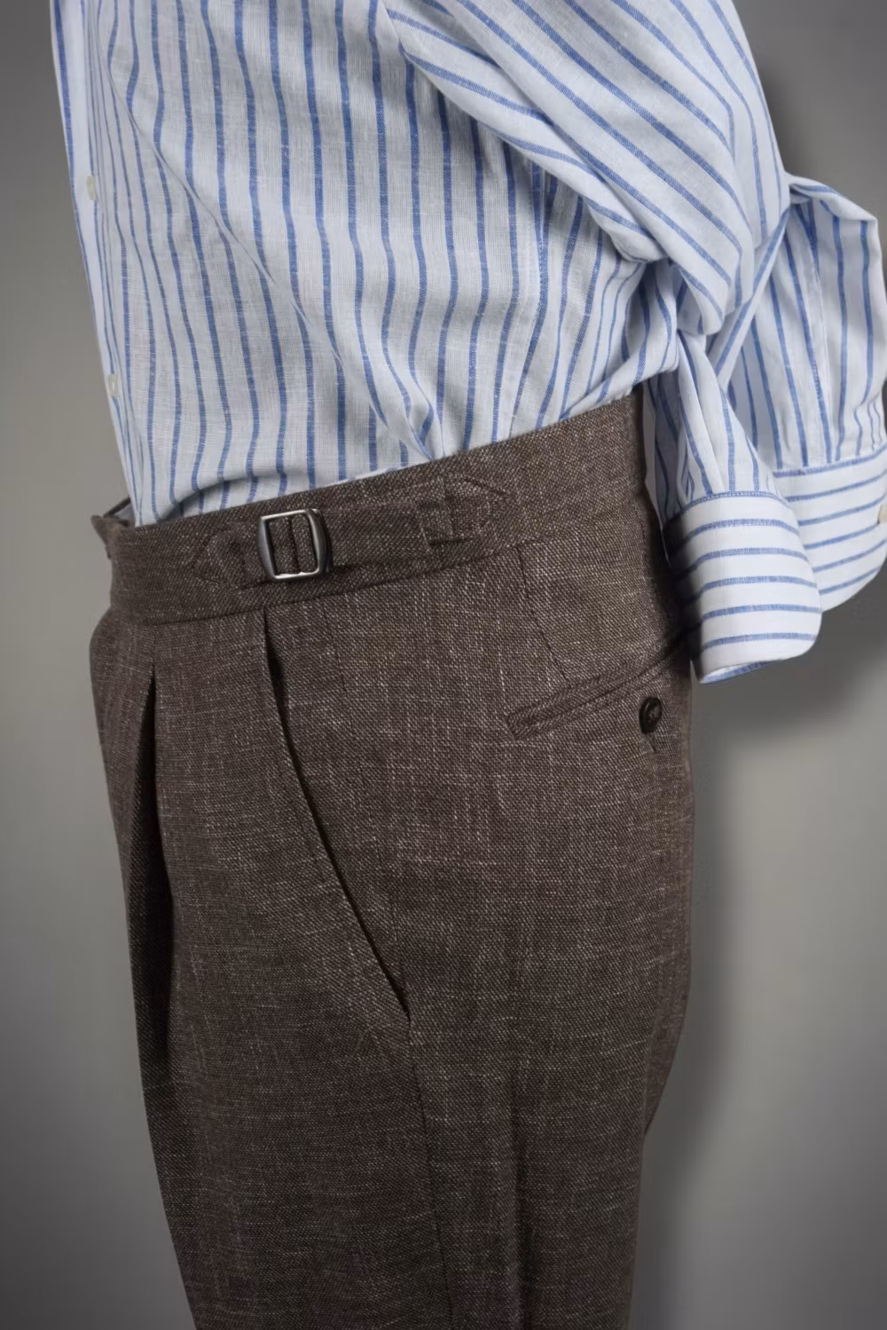Bruna byxor i bomull/linne -blandning med hög midja och sideadjusters.