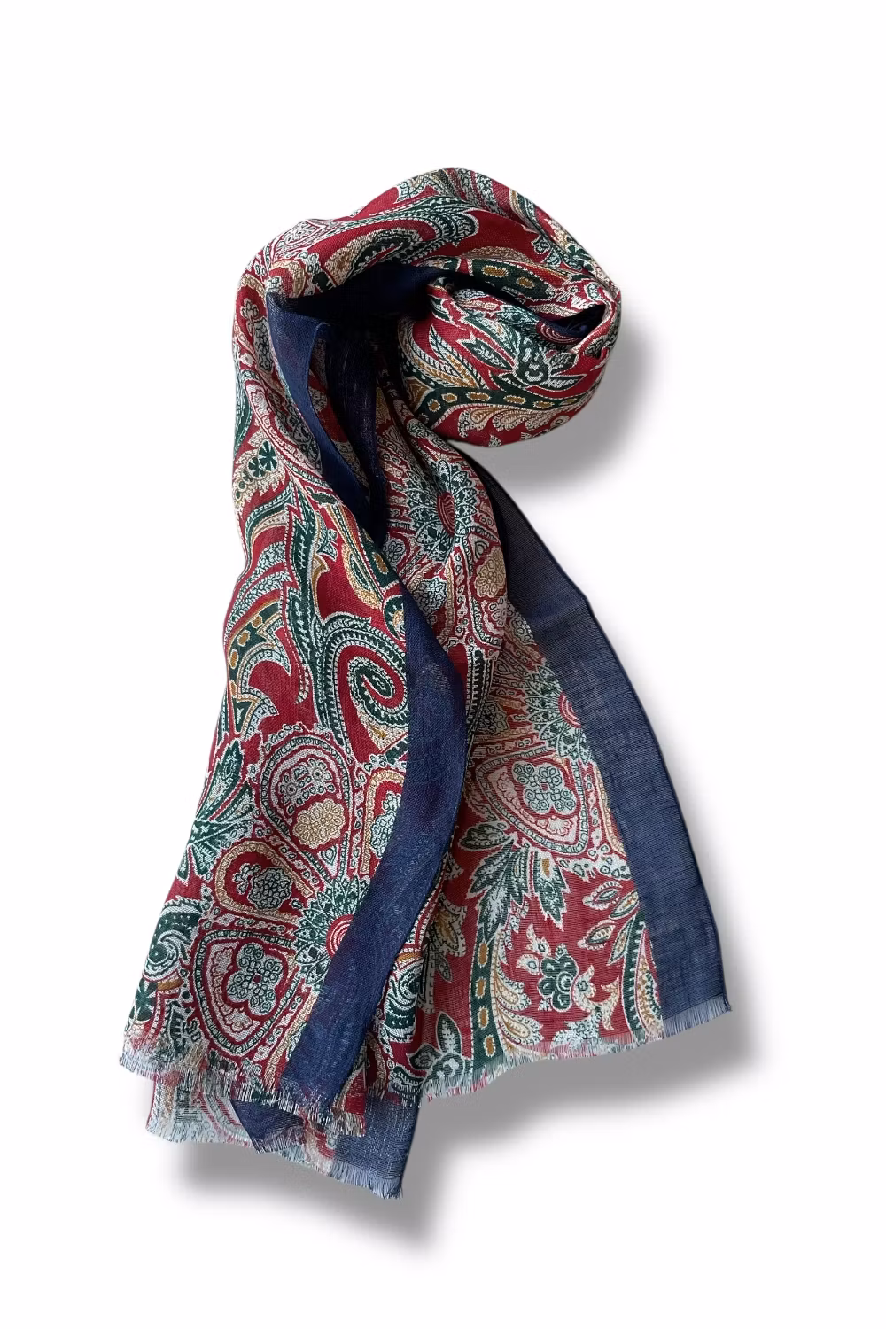 Paisley Linen Scarf - Burgundy/Green/Mustard/Navy 1 199 kr I lager. Lägg i korgen Dela Artikelnummer: 6542 Information Recensioner Elegant tunn linne -scarf med printat Paisley -mönster i klassisk storlek.100% linneMäter 180 x 55 cmTillverkad i Italien