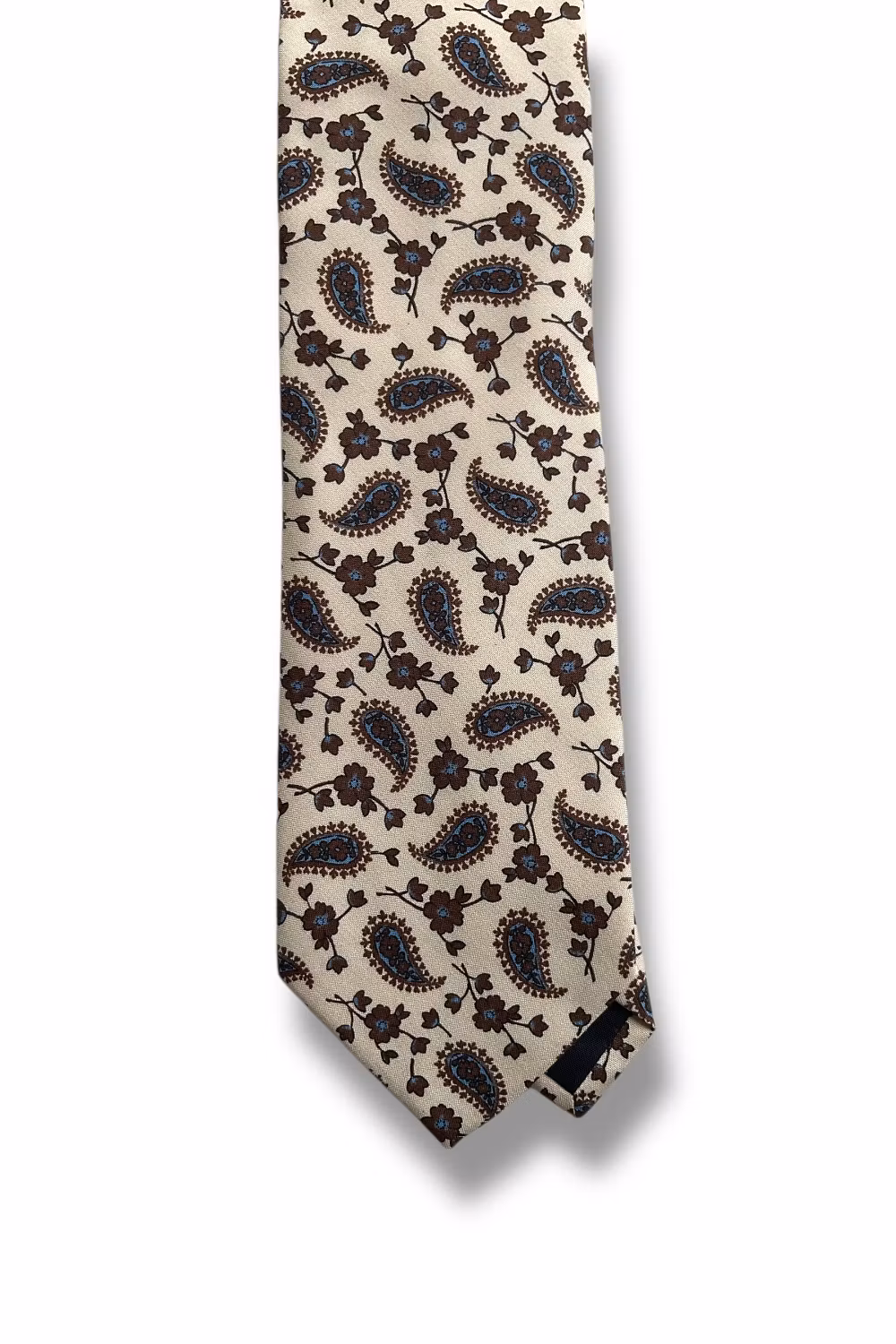 Paisley Cotton Tie - Cream/Brown/Light Blue 799 kr I lager. Lägg i korgen Dela Artikelnummer: 6573 Information Recensioner Slips i 100% bomull med tryckt mönsterThreefold konstruktion med lätt foderGer en tight knut och fint fallMått: 150x8 cmTillverkad för hand i södra Italien