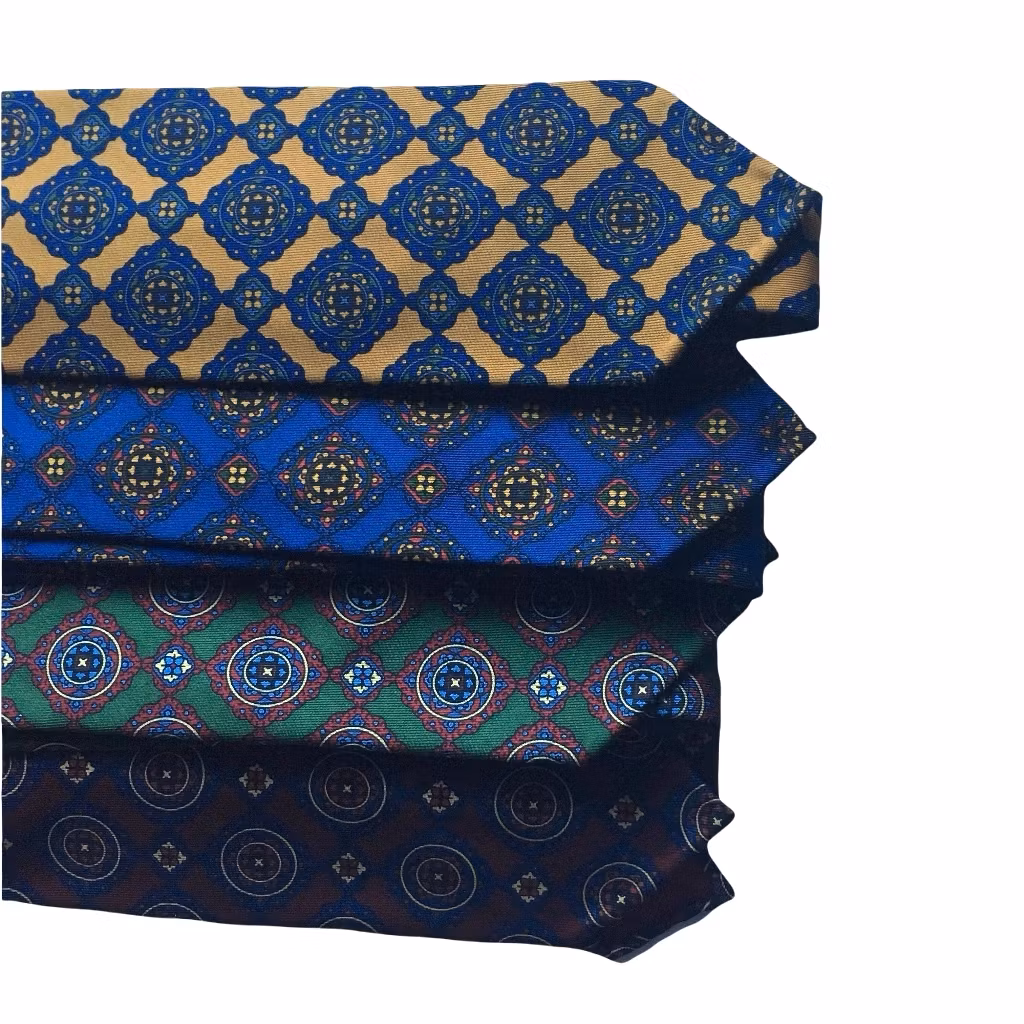 "a classic and time consuming construction that gives the printed silk tie its perfect drape, knot and feel"